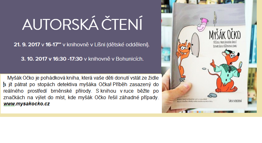 Přijďte si poslechnout pohádku Myšák Očko a zazpívat si :) První detektivní kniha s reálnými značkami na cestě či plotu v Brně :)